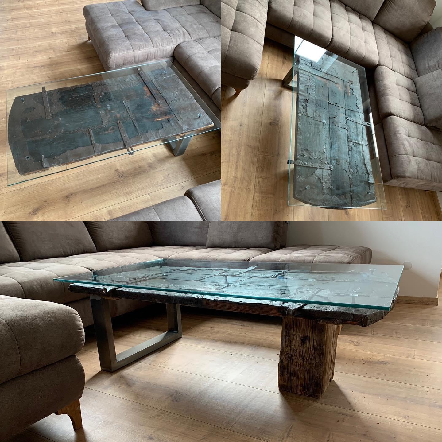 Couchtisch mit einer alten Türe und Glasabdeckung